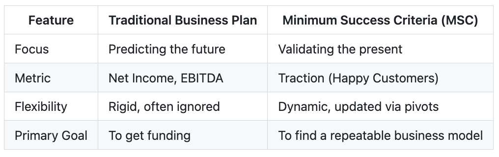 Without a predefined Minimum Success Criteria, founders tend to “move the goalposts.” If they hit 100 users instead of 1,000, they tell themselves, “Well, those 100 are really high quality!” The MSC prevents this “zombie startup” state—where a company isn’t growing enough to matter but isn’t failing enough to die.